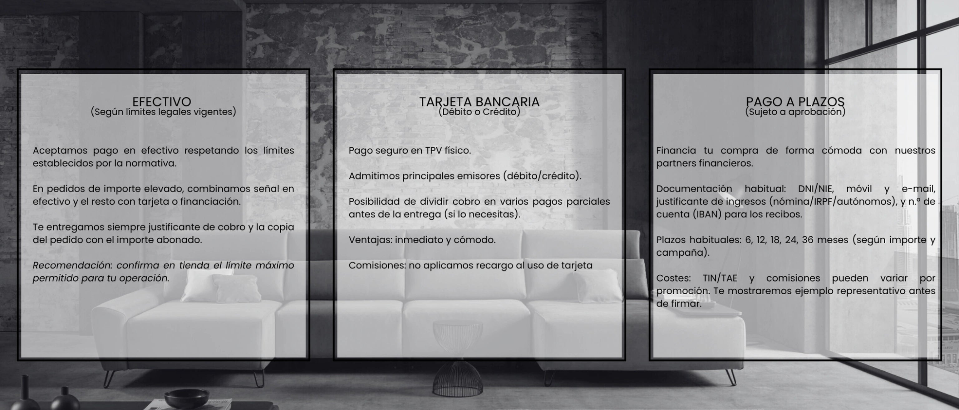 Efectivo (según límites legales), tarjeta (débito/crédito) y pago a plazos con entidades colaboradoras (sujeto a aprobación).