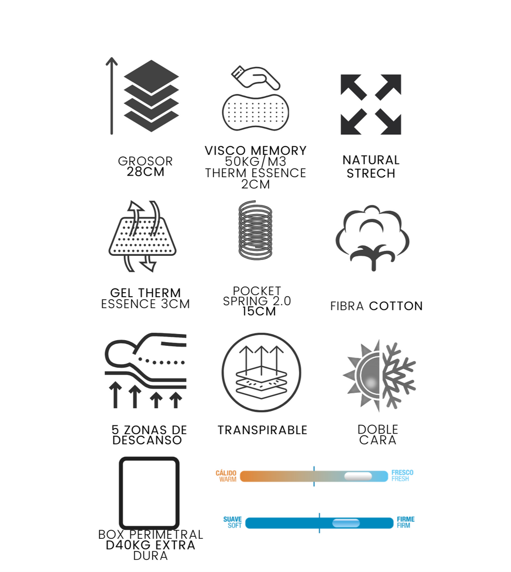 Con Gel-Therm, muelles ensacados y Box perimetral D40Kg, diseñado para cuidar tu postura y ofrecerte noches más frescas y reparadoras.