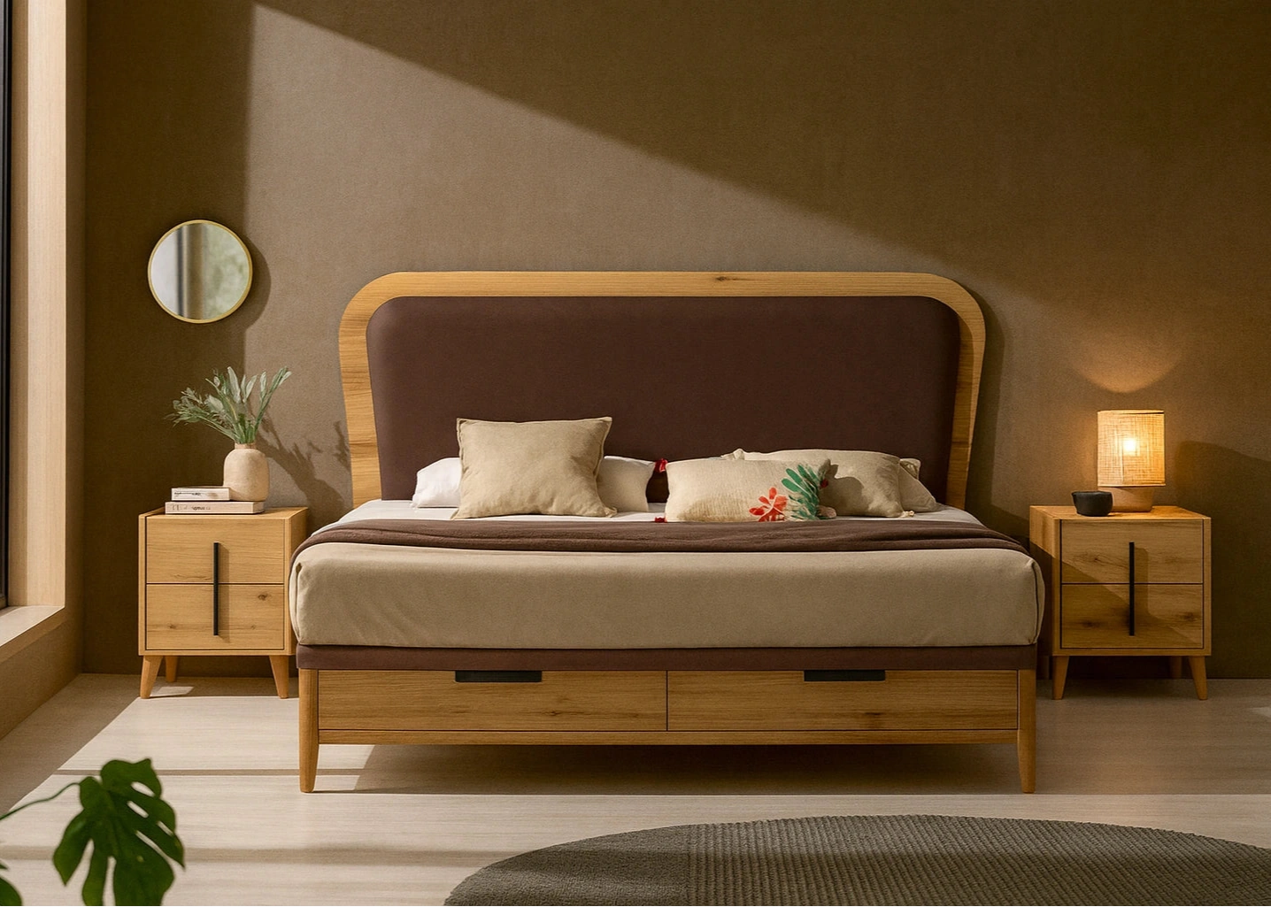 Canapé abatible de madera que cuenta con patas de madera que lo estilizan al elevarlo del suelo. Un canapé de madera que aporta naturalidad a cualquier dormitorio.