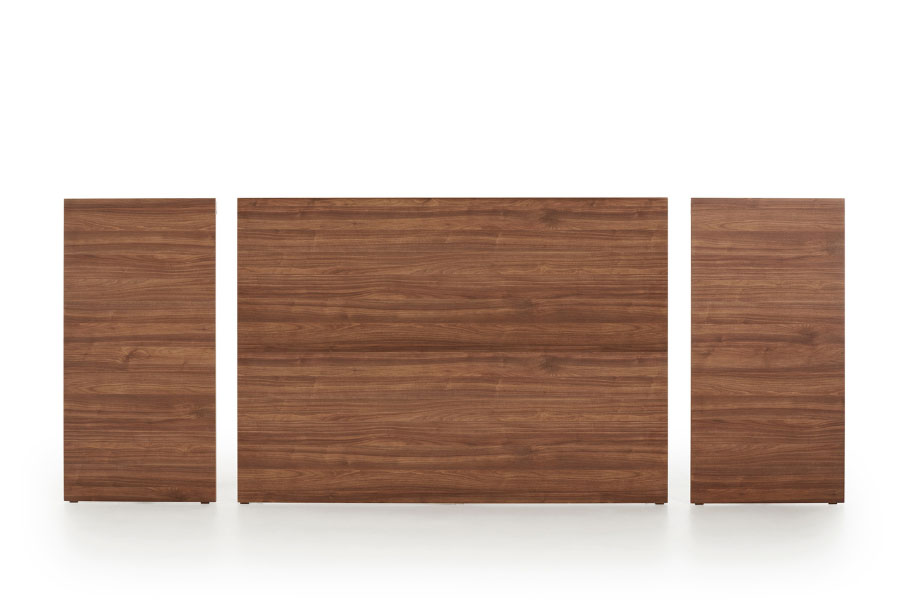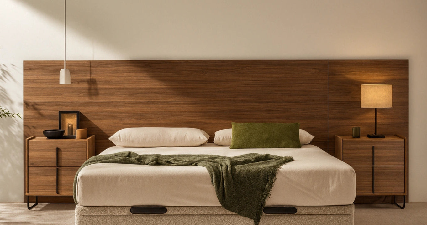 Cabecero de cama formado por conjunto de paneles de madera. Posibilidad de cubrir la cama y las mesitas de noche, o solo la cama.