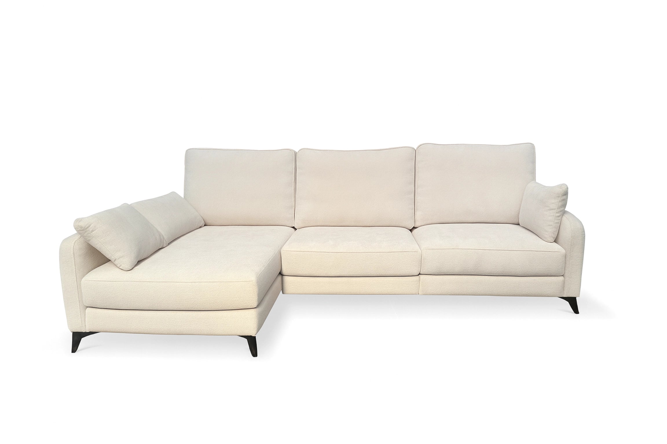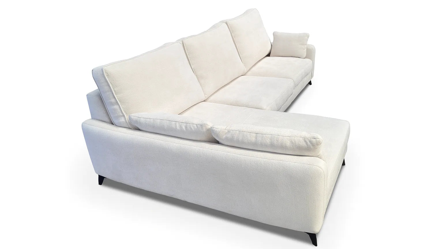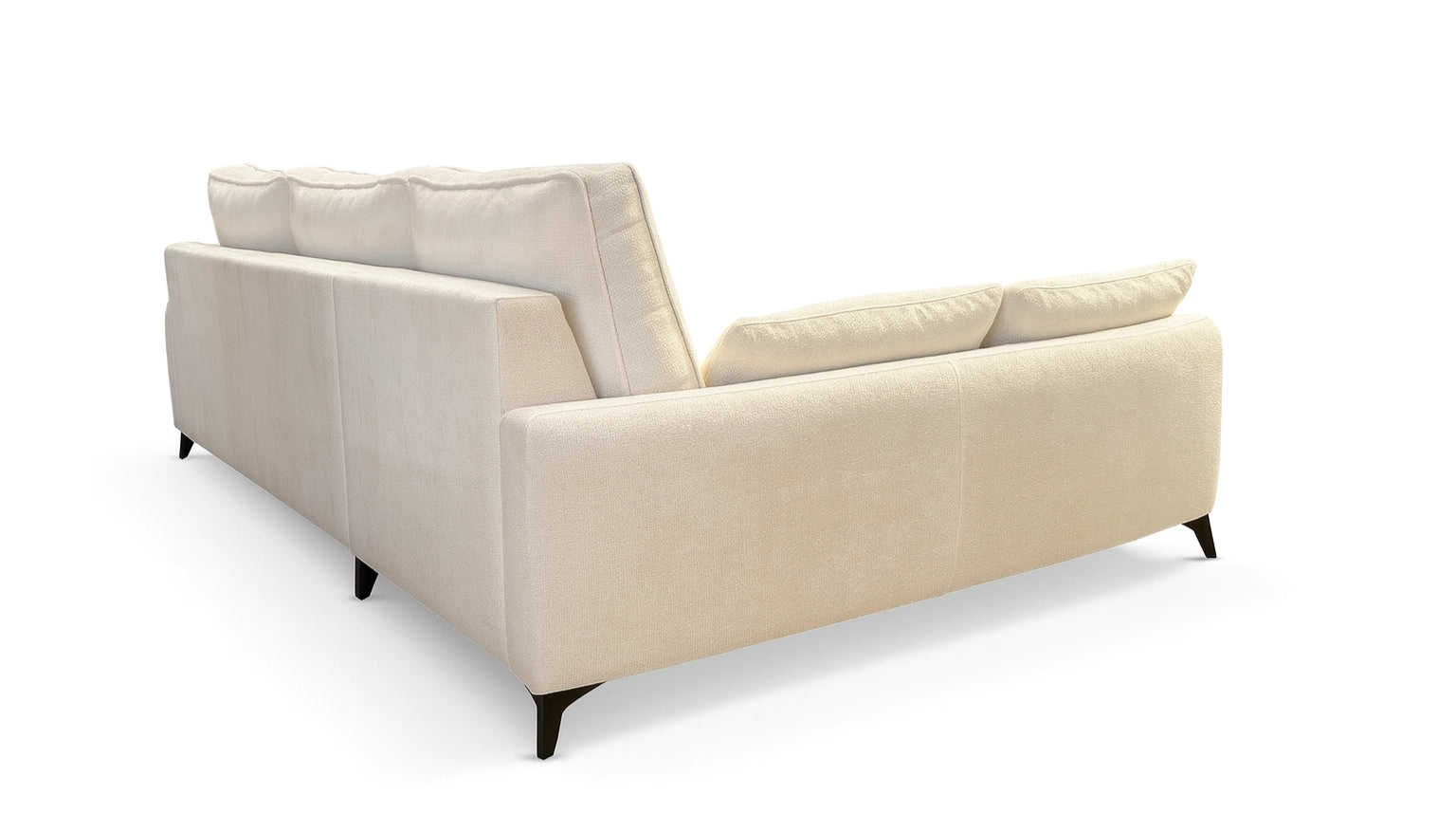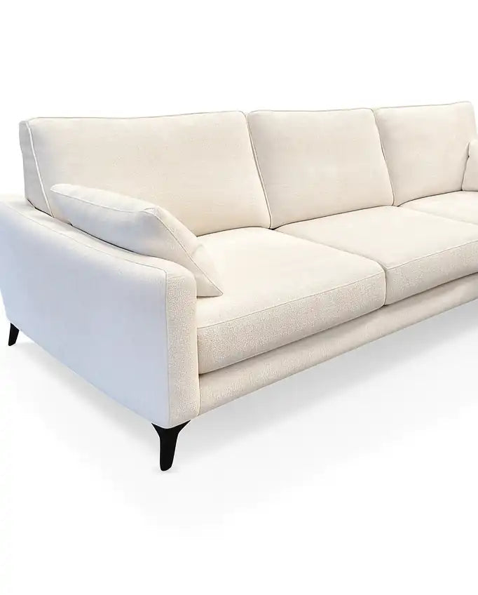 Sofá chaise longue de diseño elegante y minimalista con patas altas negras, asientos amplios y respaldo cómodo.